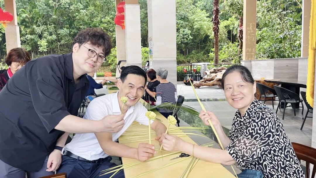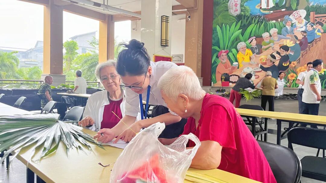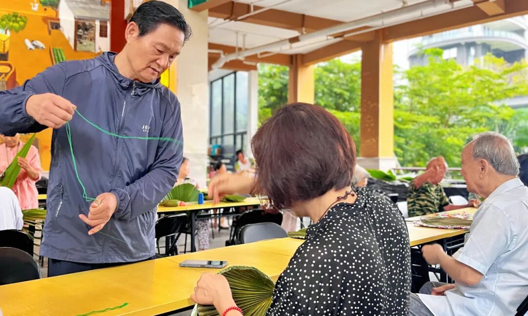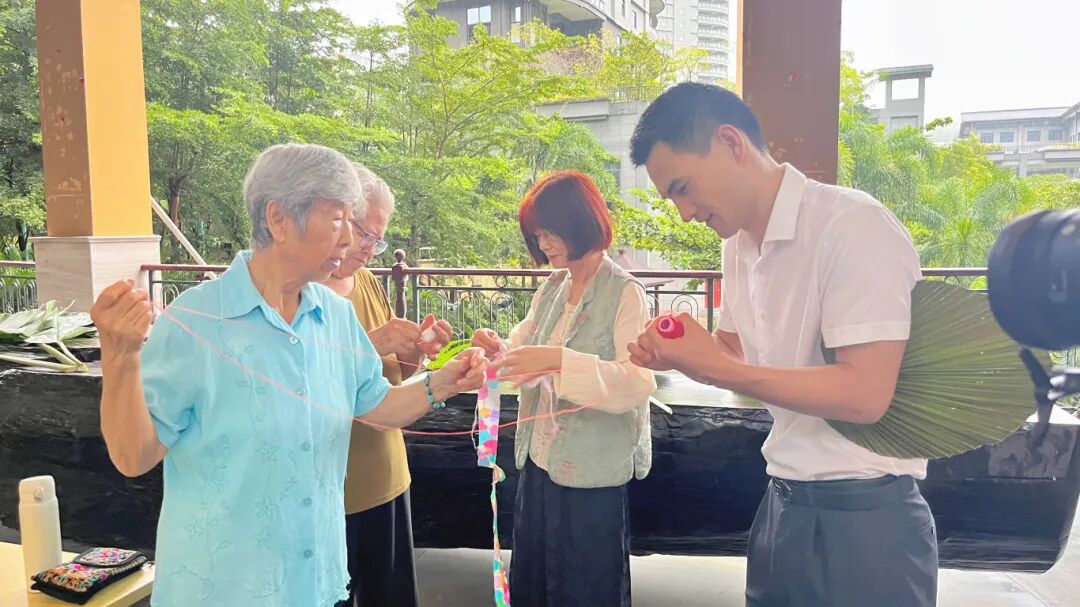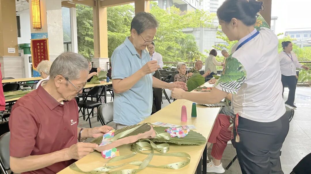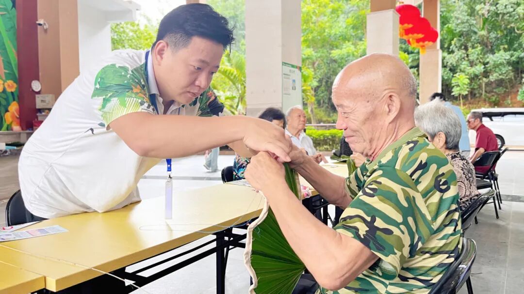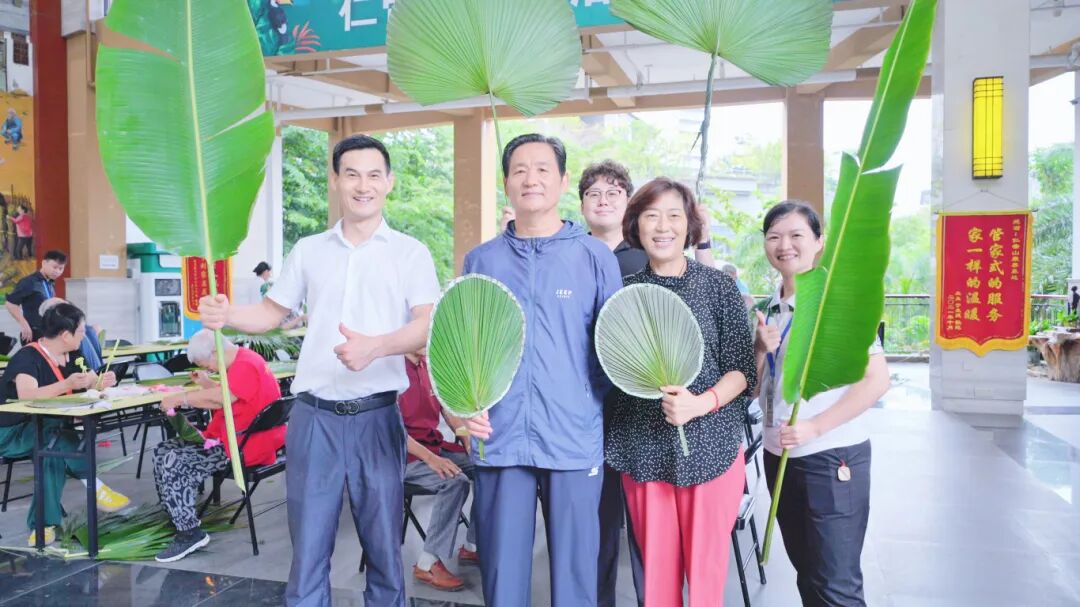 从一支支素面扇叶到一把把精美蒲扇,大家都用心雕琢着自己的作品。指尖翻飞间,有人裁剪出形状不一的扇面,有人折叠出象征浪漫的玫瑰。管家们穿梭其间,为有需要的叔叔阿姨穿针引线,活动现场温馨而热闹。