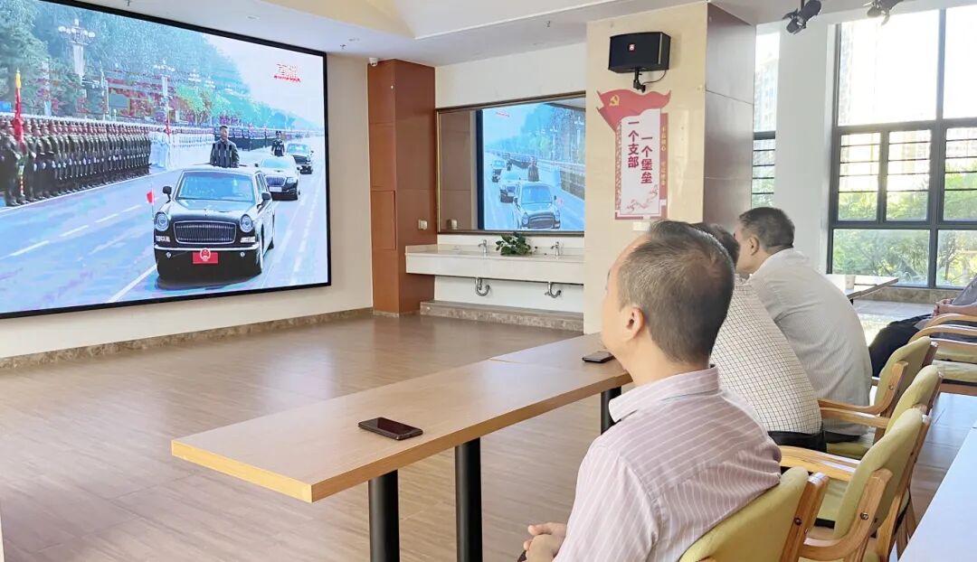 五指山仁商基业有限公司党支部的党员同志们佩戴着党徽,聚精会神地端坐于大屏幕前。这一刻,大家都沉浸在阅兵的庄严与震撼之中,不时为受阅部队的飒爽英姿和现代化武器装备的卓越成就鼓掌喝彩。