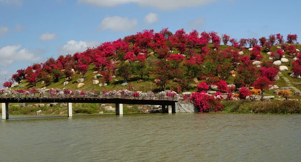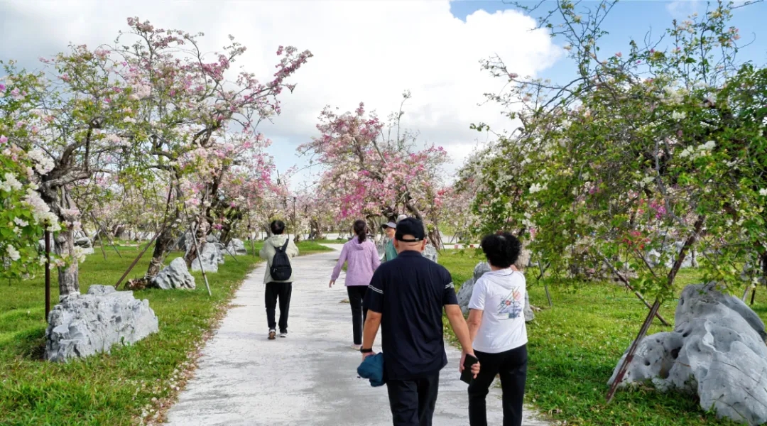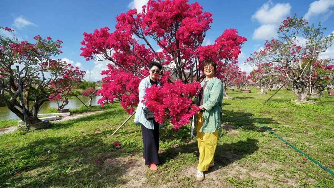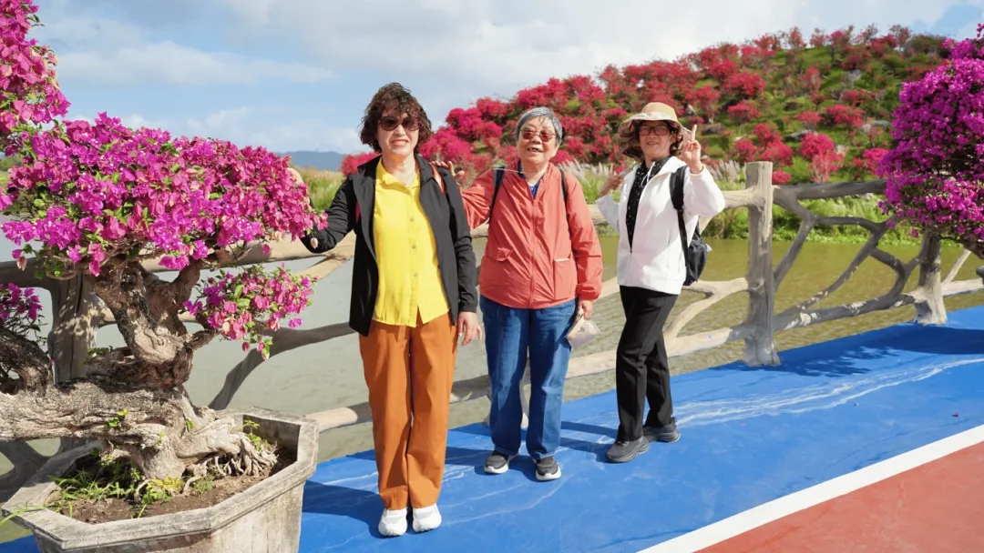 抵达第一站南湾花镇,大家沿着小道悠然漫步,两旁的三角梅正值绽放的好时节,清甜的花香随风阵阵扑面而来。远远望去,整片花海宛如彩色的浪潮,在微风中轻轻摇曳。