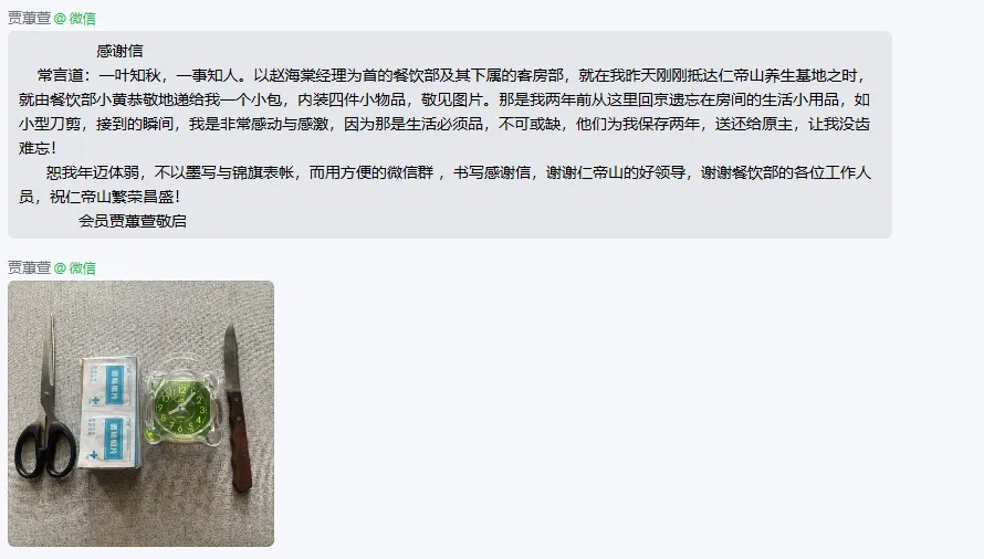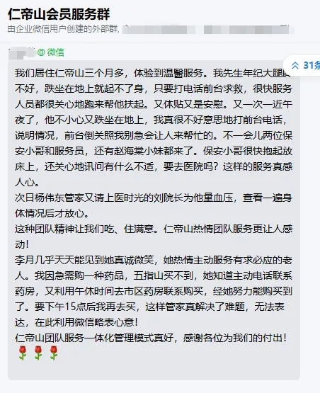 近日,一封感谢信出现在会员群里,它没有华丽的辞藻,却字字真挚、格外暖心。这是一位新入住会员写下的心声,满含对仁帝山团队服务的赞许。信中提到了管家部的周到陪伴、酒店部的细致关怀,以及上医时光的专业服务,正是这些贴心的举动,让她们感受到了家的温暖。