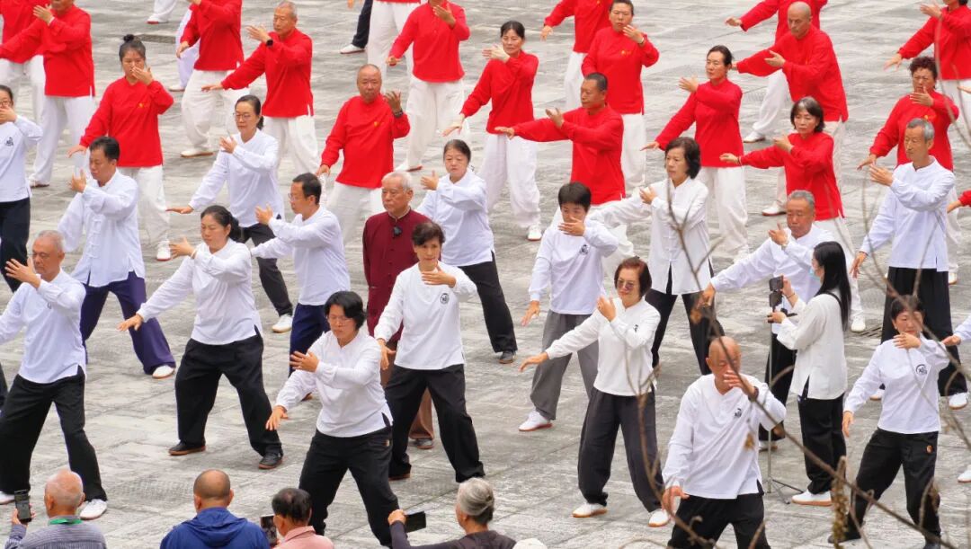来自全国各地近百名太极爱好者齐聚仁帝山参加培训,其中还有两名外籍学员同场习练。赵幼斌老师亲临现场悉心指导,大家在平稳舒缓的音乐中循序起势,一招一式连贯从容,场面庄重而壮观。
